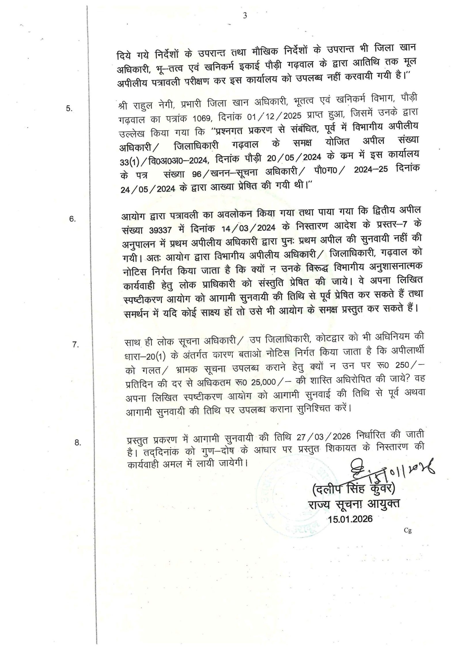 जिसपर सूचना का अधिकार का उल्लंघन देखते हुए सूचना आयुक्त दलीप सिंह कुंवर ने जिलाधिकारी गढ़वाल को कारण बताओ नोटिस जारी कर दिया कि क्यों न उनके विरुद्ध विभागीय अनुशासनात्मक कार्यवाही हेतु लोक प्राधिकारी को संस्तुति प्रेषित की जाय, साथ ही लोक सूचना अधिकारी को भी भ्रामक सूचना उपलब्ध कराने के लिए 250 रुपए प्रतिदिन के हिसाब से पच्चीस हजार रुपयों तक की शास्ति का नोटिस जारी कर दिया है।